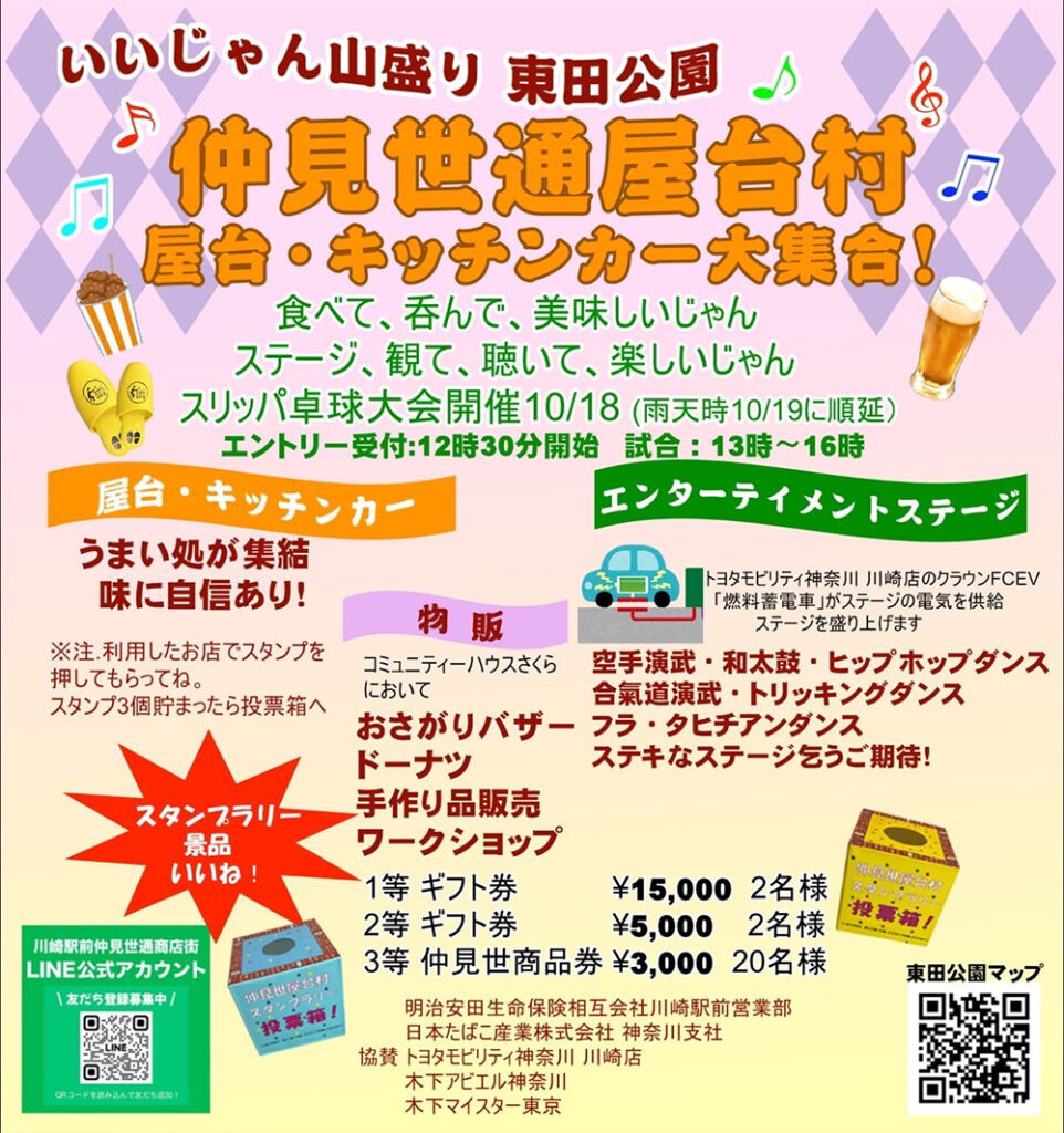 イベント期間中は仲見世通商店街も東田公園にて、様々な屋台やキッチンカーが大集合する「仲見世通屋台村」やステージイベントを開催。皆さまのご来場お待ちしております。